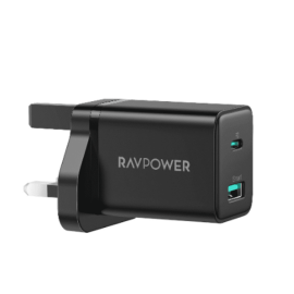 راف باور شاحن جداري 20 واط بمنفذ تايب سي ومنفذ يو اس بي + كيبل من تايب سي الى لايتنينق 1 متر - اسود